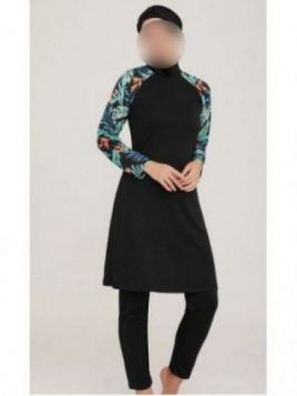 Burkini turban, high collar 4-piece: tunic, pants, bra and turban Bow-effect turban Tropical print on sleeves Slightly flared tunic Straight-fitting pants Composition = 100% polyester Stretch fabric Chlorine-resistant Machine washable
